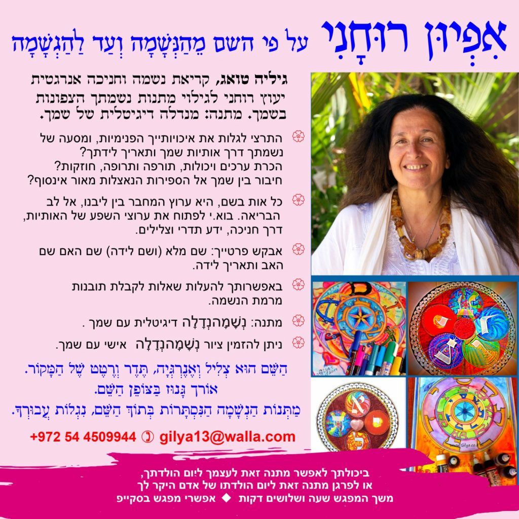לפרטים וקביעת מפגש ייעוץ, אִפְיוּן רוּחָנִי עַל פִּי הַשֵּׁם: