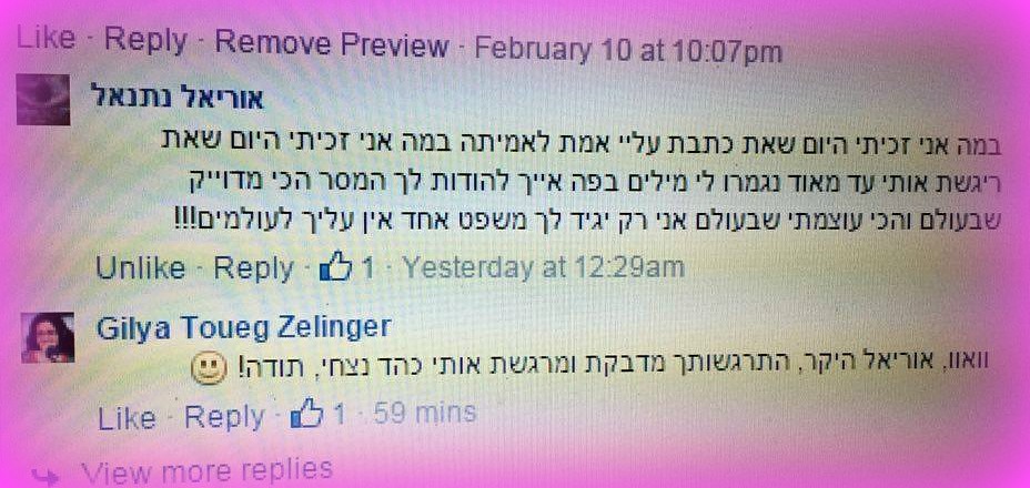 "במה אני זכיתי היום שאת כתבת עליי אמת לאמיתה במה אני זכיתי היום שאת ריגשת אותי עד מאוד נגמרו לי מילים בפה אייך להודות לך המסר הכי מדוייק שבעולם והכי עוצמתי שבעולם אני רק יגיד לך משפט אחד: אין עליך לעולמים!"